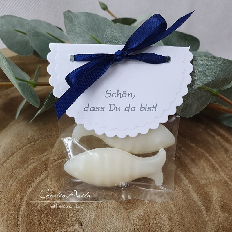 2 Stück Seifenfische Groß Fix & Fertig in Cellophan - Pfiffig - Weiß mit Dunkelblauer Schleife