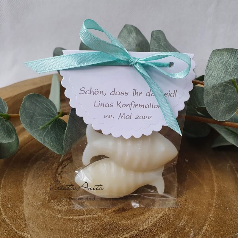 2 Stück Seifenfische Groß Fix & Fertig in Cellophan - Pfiffig - Weiß mit Mint
