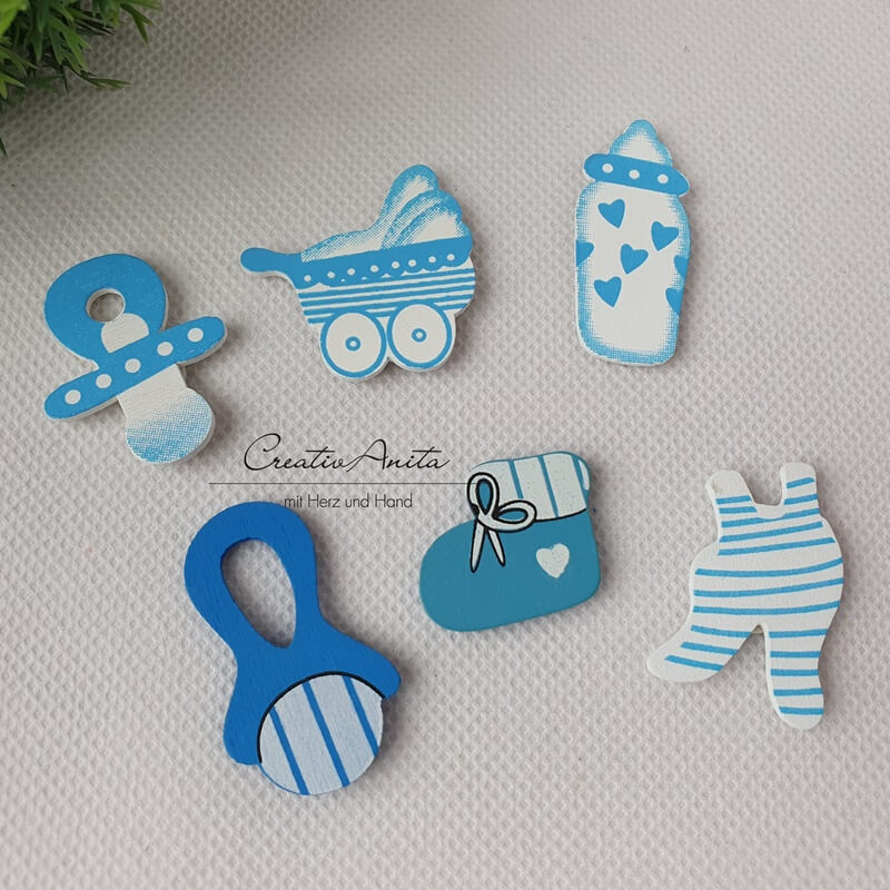 Süße Holzstreuteile Baby in Blau - Scrapbooking - 6 Stück