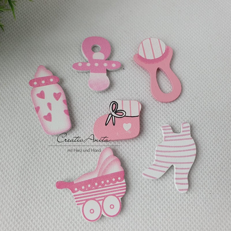 Süße Holzstreuteile Baby in Rosa - Scrapbooking - 6 Stück