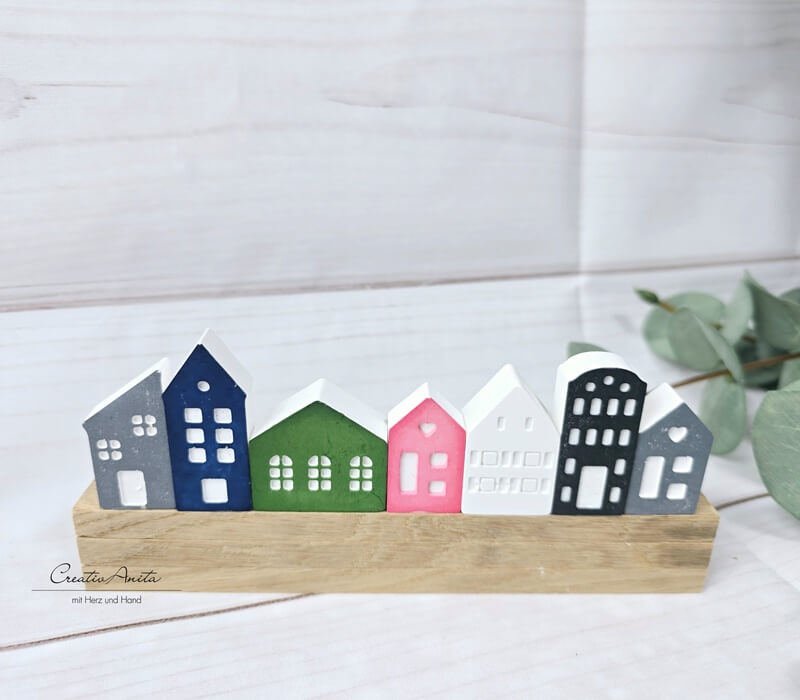 7 Mini-Häuser - Dekoration auf Holzleiste - Bunt