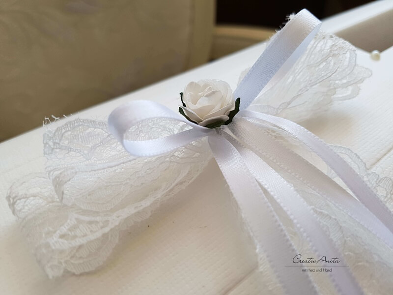 Deko: Spitzenband und weitere diverse Schleifenbänder, Papierröschen oder Perlen, Prägeelemente, Sticker