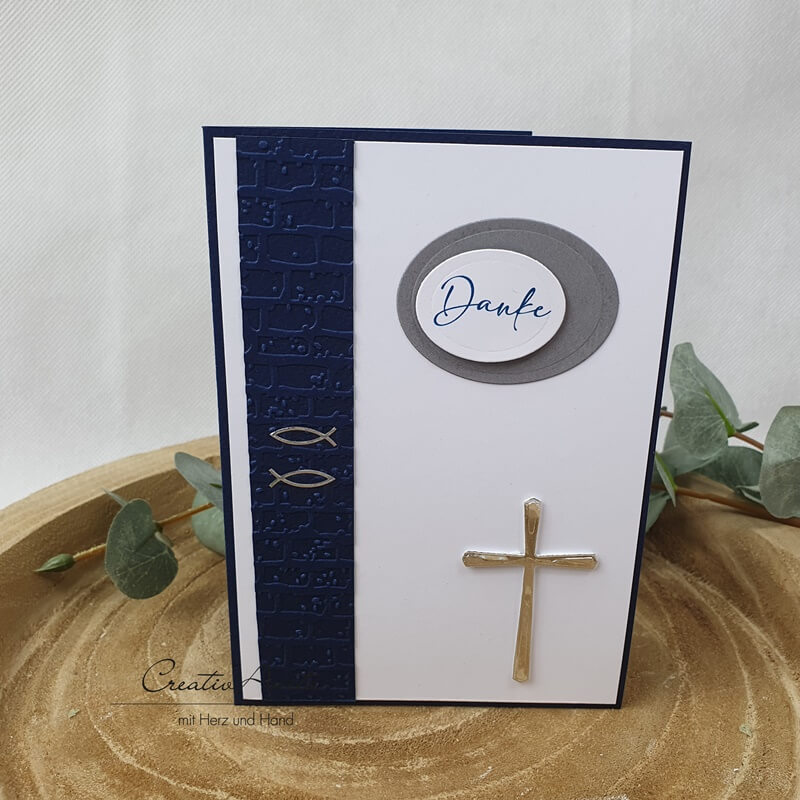 Handgearbeitete Danksagungskarte "Christlich" in Dunkelblau-Weiß