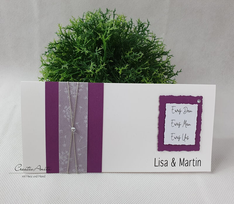 Handgearbeitete Einladungskarte im DIN lang Format und Weiß-Violett.