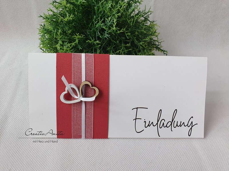 Handgearbeitete Einladungskarte im DIN lang Format und Weiß.