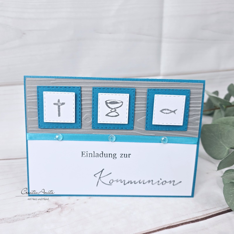 Wunderschöne moderne Einladungskarte zur Kommunion. Die Karte wurde mit dem Schriftzug "Einladung zur Kommunion bestempelt. Der obere Teil der Karte wurde in Holzoptik handgeprägt. Diesen Teil zieren 3 handbestempelte Stanzteile mit den Motiven "Kreuz, Kelch und Fisch"