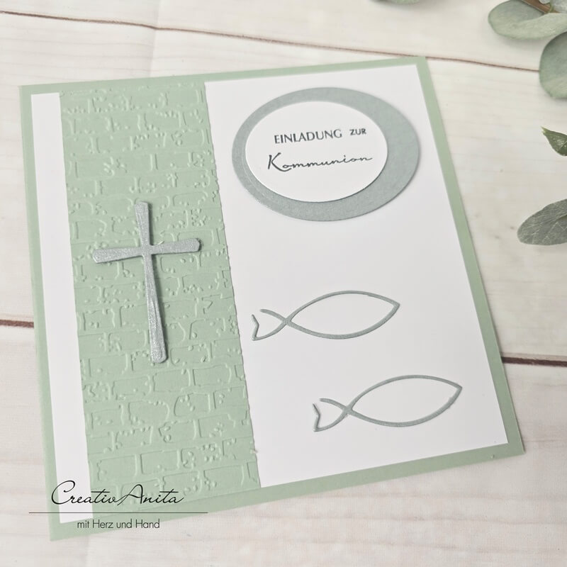 Material: Kartenkarton, Stanzelemente Fische, Kreuz, handgeprägter Streifen in Maueroptik - inklusive Einlegeblatt und Umschlag