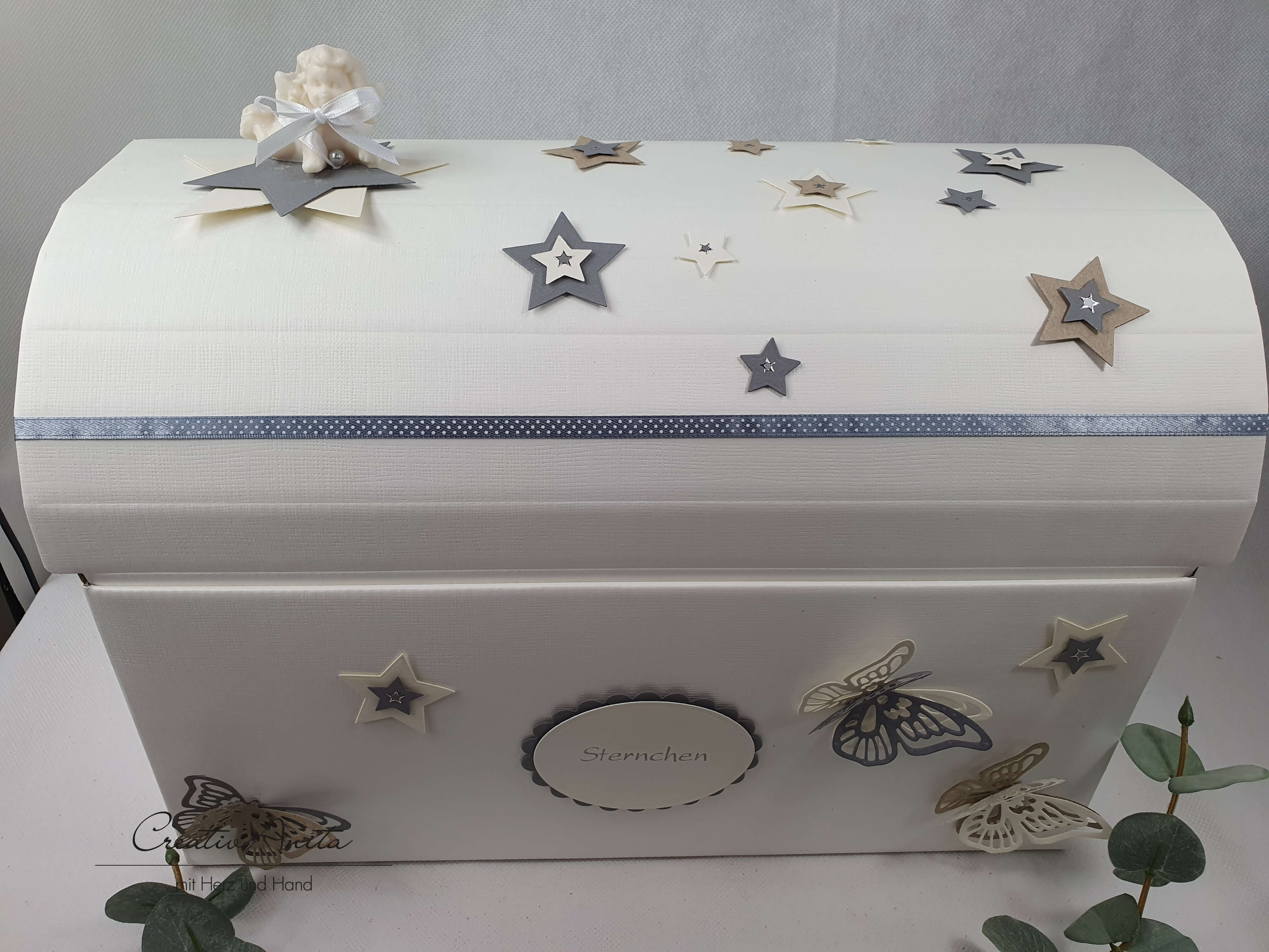 Erinnerungsbox oder Geschenkbox in Form einer Truhe zur Geburt oder Taufe.
