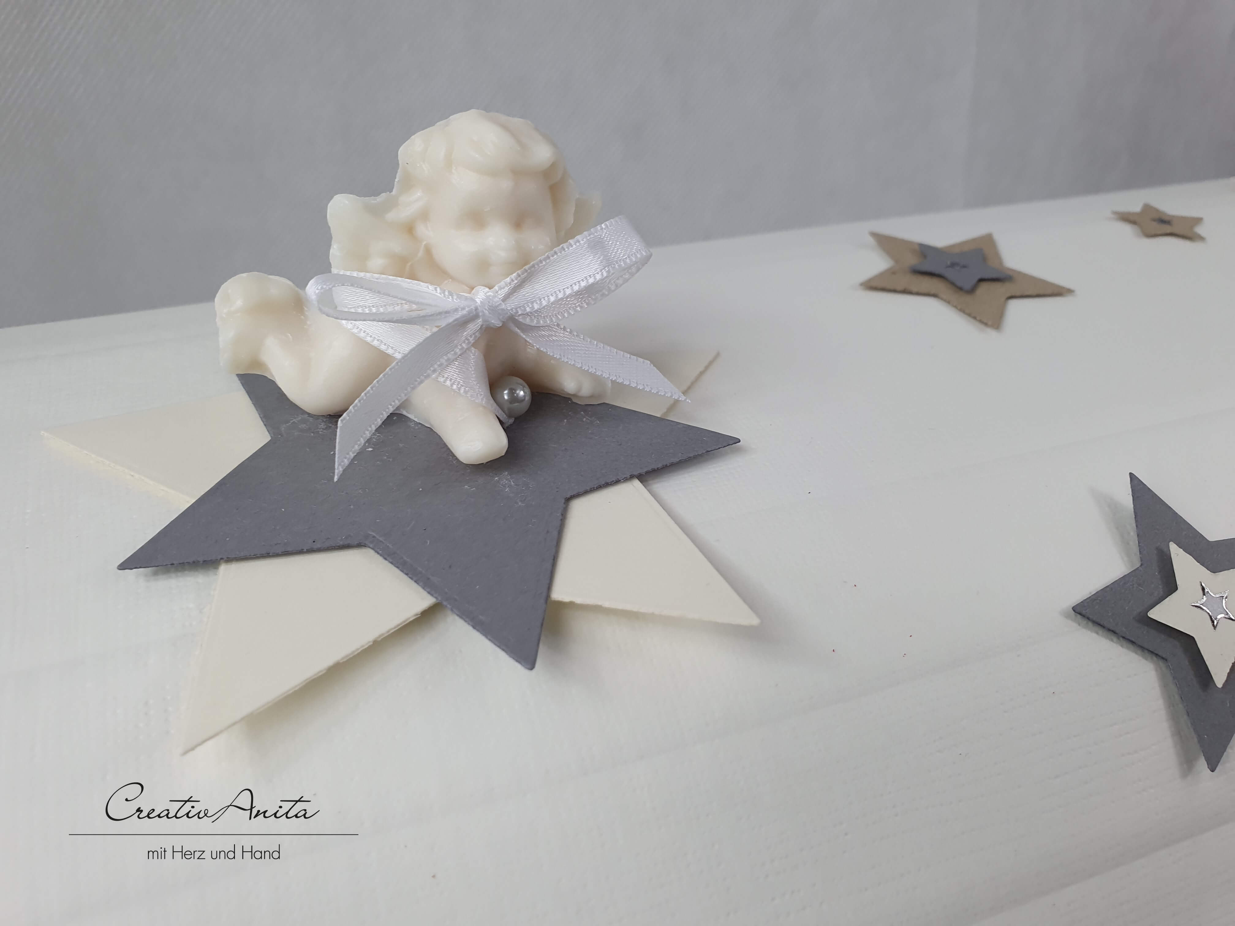 Dekoriert wurde sie in liebevoller Handarbeit mit einer Engelsfigur sowie verschiedenen Sternen, üppigem Schleifenband sowie Schmetterlinge.