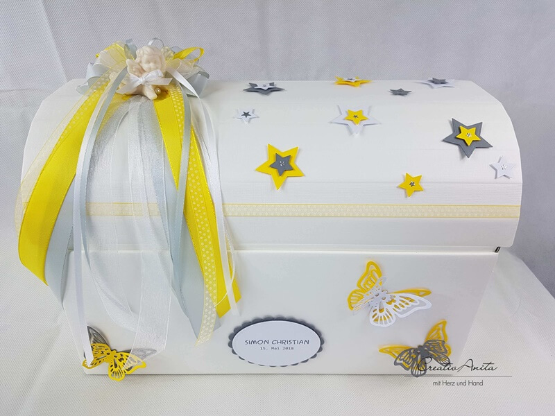 Erinnerungsbox oder Geschenkbox in Form einer Truhe zur Geburt oder Taufe.