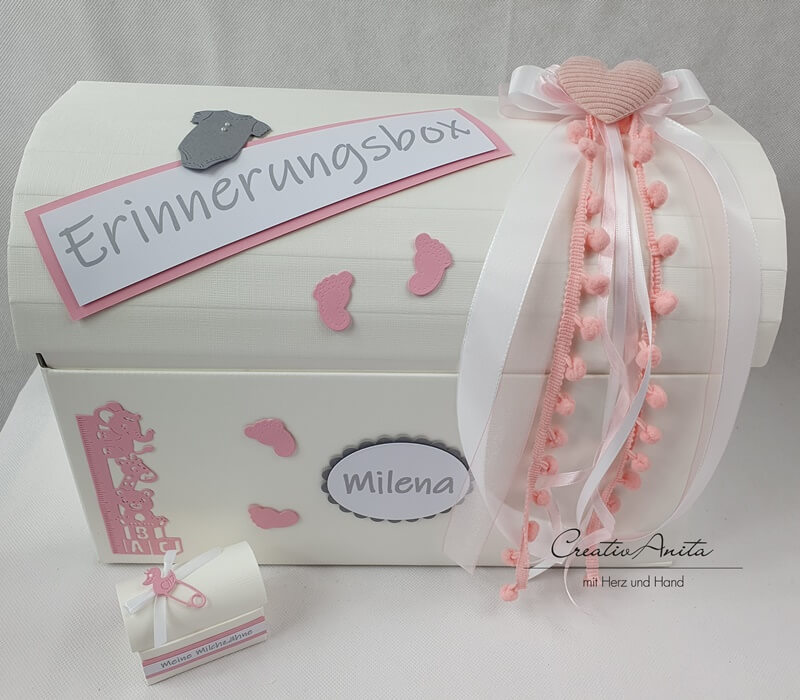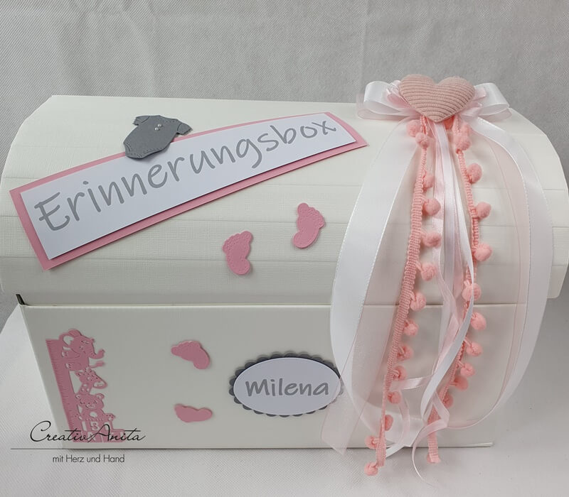 Dekoriert wurde sie in liebevoller Handarbeit mit handgestanzten Babyaccessoires, weißem Stoffherz, sowie einem Schriftzug "Erinnerungsbox".