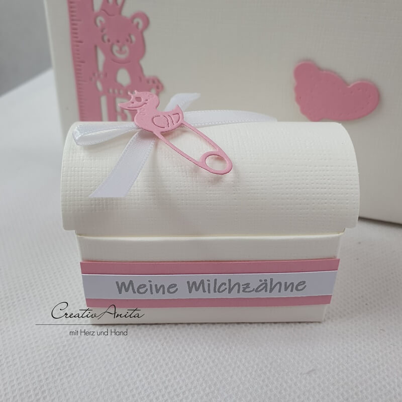 Erinnerungsbox oder Geschenkbox in Form einer Truhe zur Geburt oder Taufe, inkl. Milchzahntruhe.