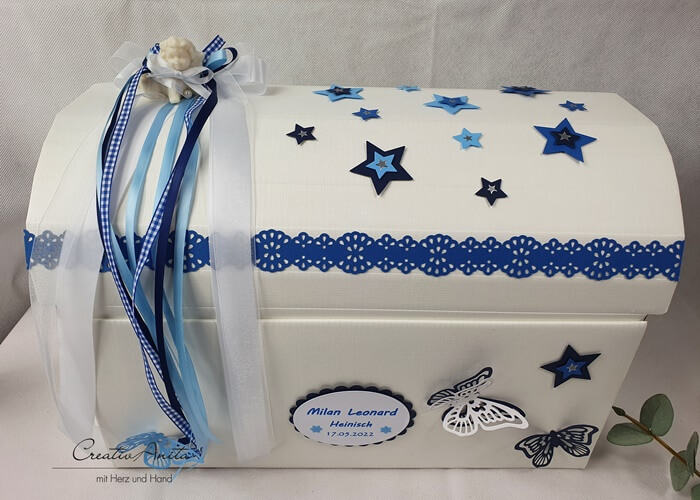 Erinnerungsbox - Erinnerungstruhe in Form einer Truhe für das STERNENKIND mit Sternen & Schmetterlingen