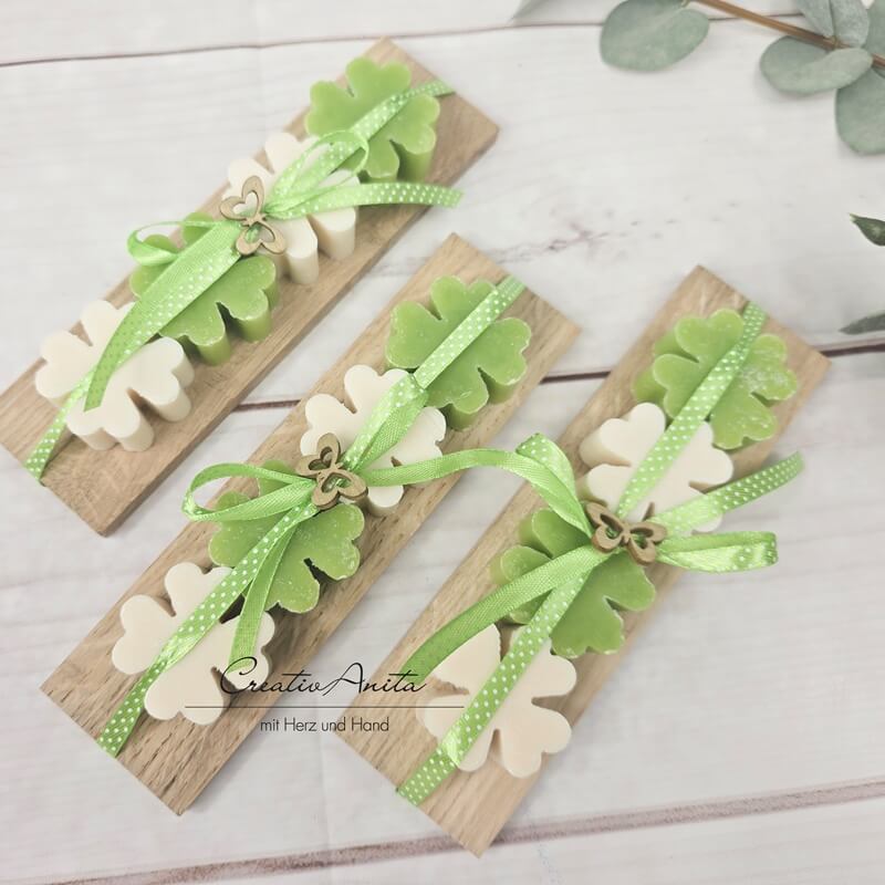 Geschenk Seifen-Kleeblätter aus Schafmilch auf Holz - Grün-Weiß