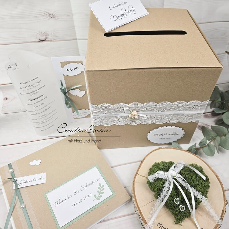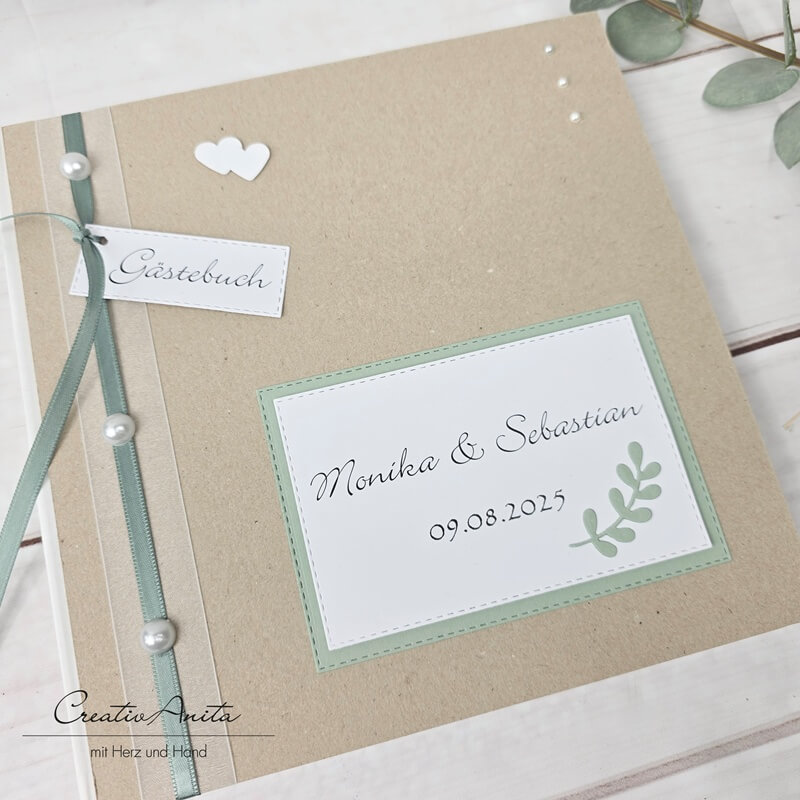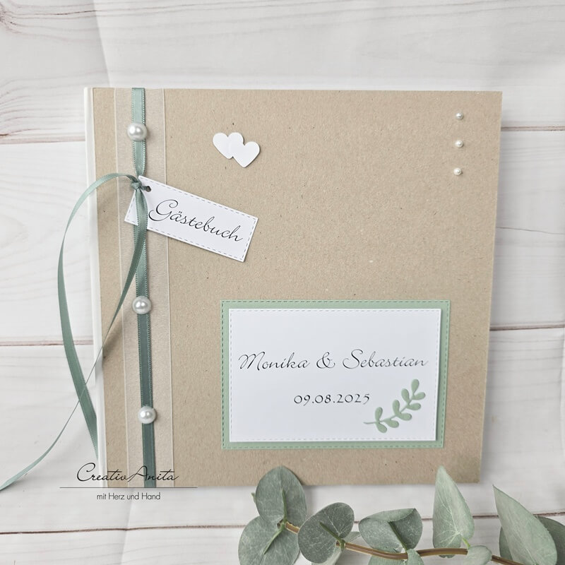 Wundervolles Gästebuch kombiniert in Natur-Eukalypthus mit Weiß.