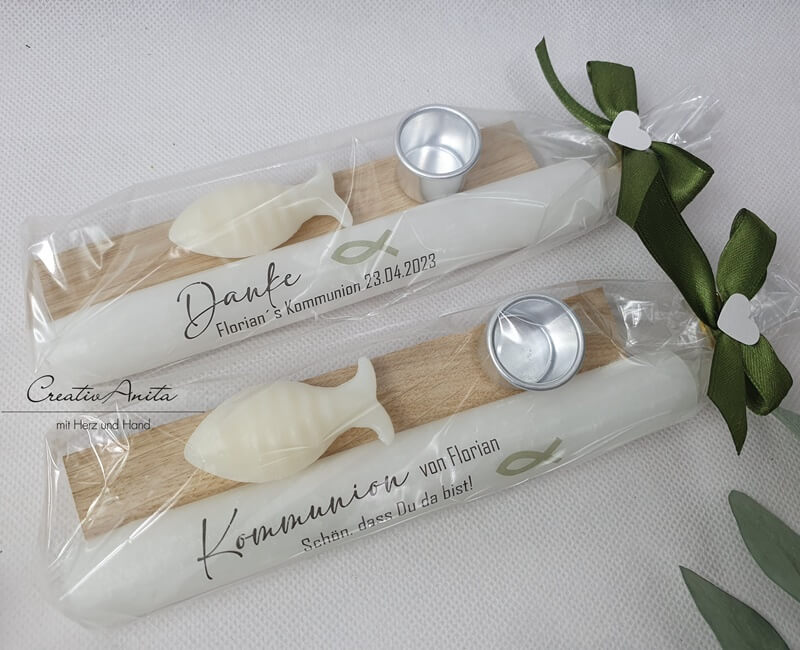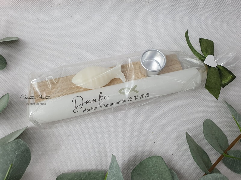 Gastgeschenk - Stabkerze mit Kerzenhalter und Seifenfisch -Danke!- Olive