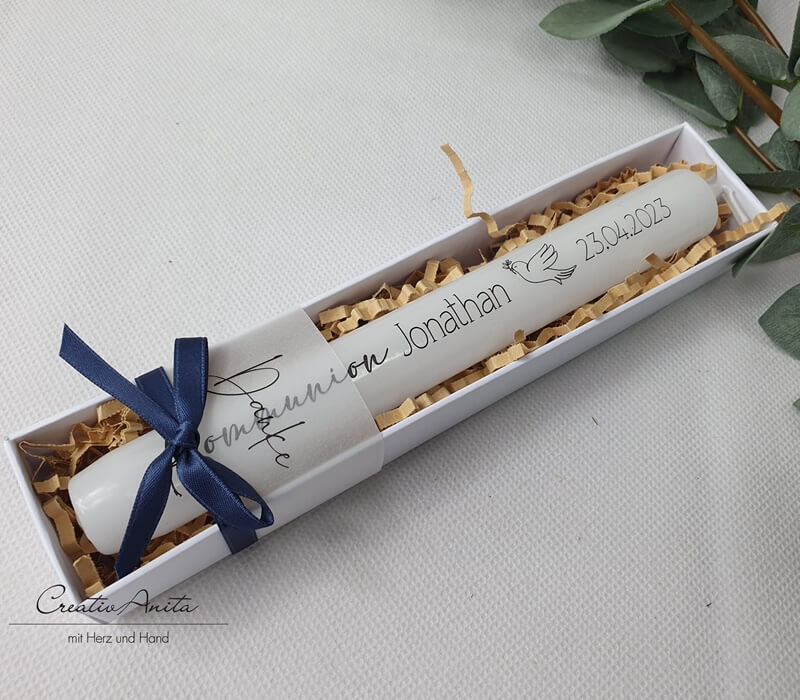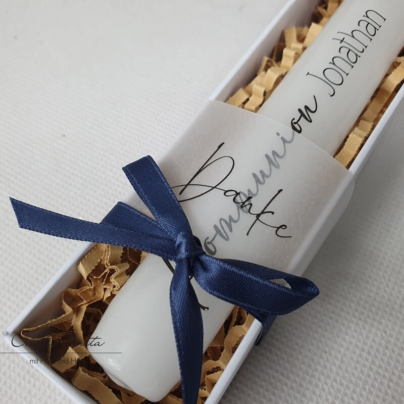 Gastgeschenk zur Kommunion - Konfirmation - Stabkerze personalisiert in Schachtel mit Danke-Banderole
