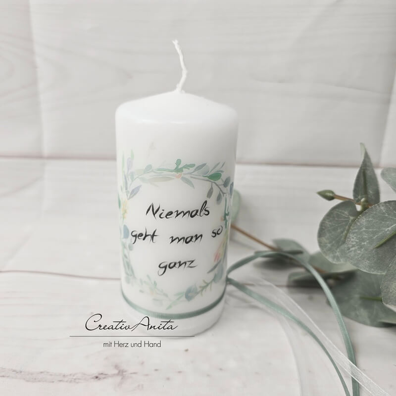 Gedenkkerze - Trauerkerze - Erinnerungskerze - Blätterkranz mit Spruch