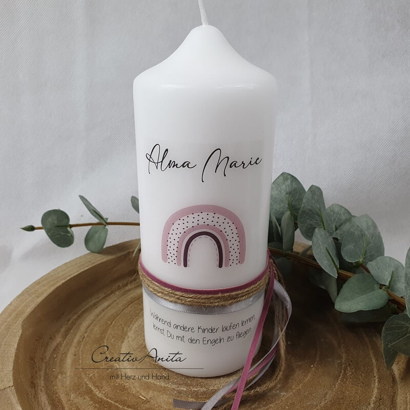 Gedenkkerze - Trauerkerze Kind mit Regenbogen - Altrosa