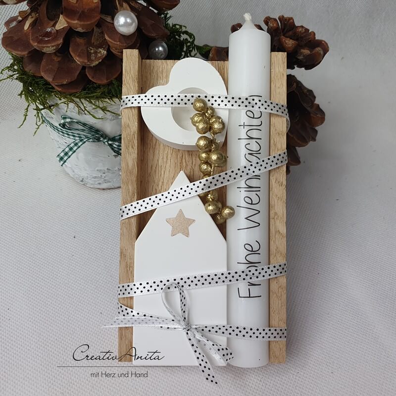 Die handgemachte Holzverpackung wurde mit einer Kerze "Frohe Weihnachten", einem Kerzenständer in Herzform und einem Haus aus Beton befüllt. Das Haus wurde noch mit einem goldenen Stern verziert. Alles zusammen kann auf der Holzverpackung trapiert werden.