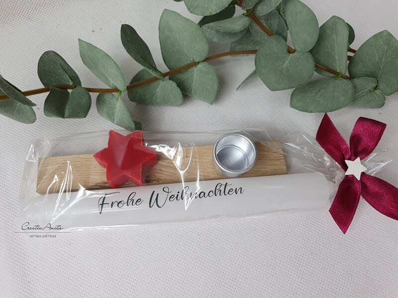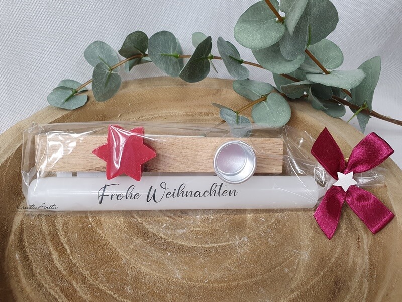 Passend dazu gibt es einen Kerzenhalter in silber, dieser ist auf einem Holz fest montiert. Die kleine Holzleiste ziert ein Seifenstern in der Duftnote Bratapfel (fruchtig).