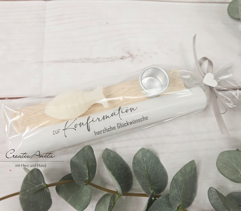 Geschenk zur Kommunion, Konfirmation - Stabkerze mit Kerzenhalter und Seifenfisch - TAUPE