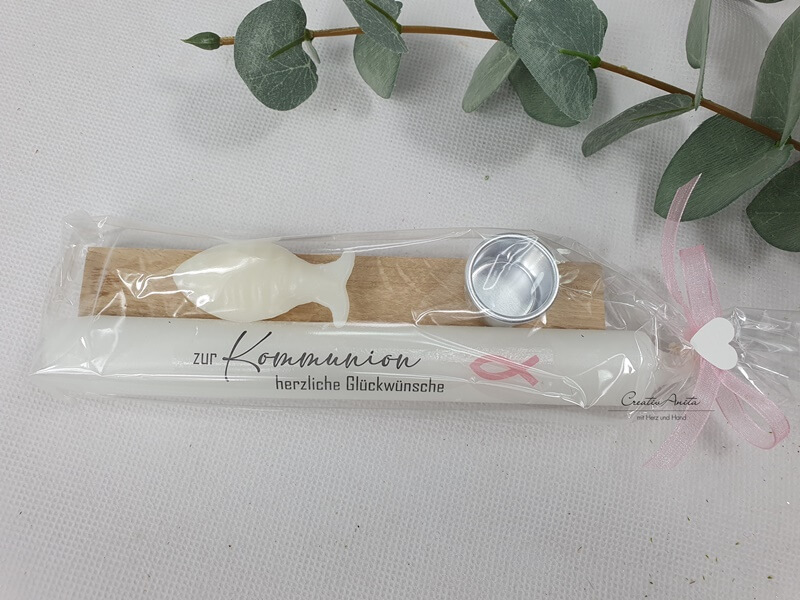 Geschenk zur Kommunion - Stabkerze mit Kerzenhalter und Seifenfisch - ROSA