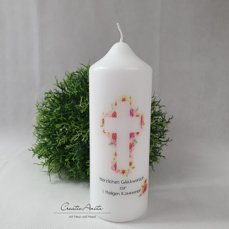 Geschenkkerze mit floralem Kreuz "Herzlichen Glückwunsch" Kommunion