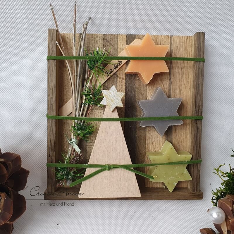 Geschenkset mit Christbaum und Seifensternen dekoriert in Holzbox