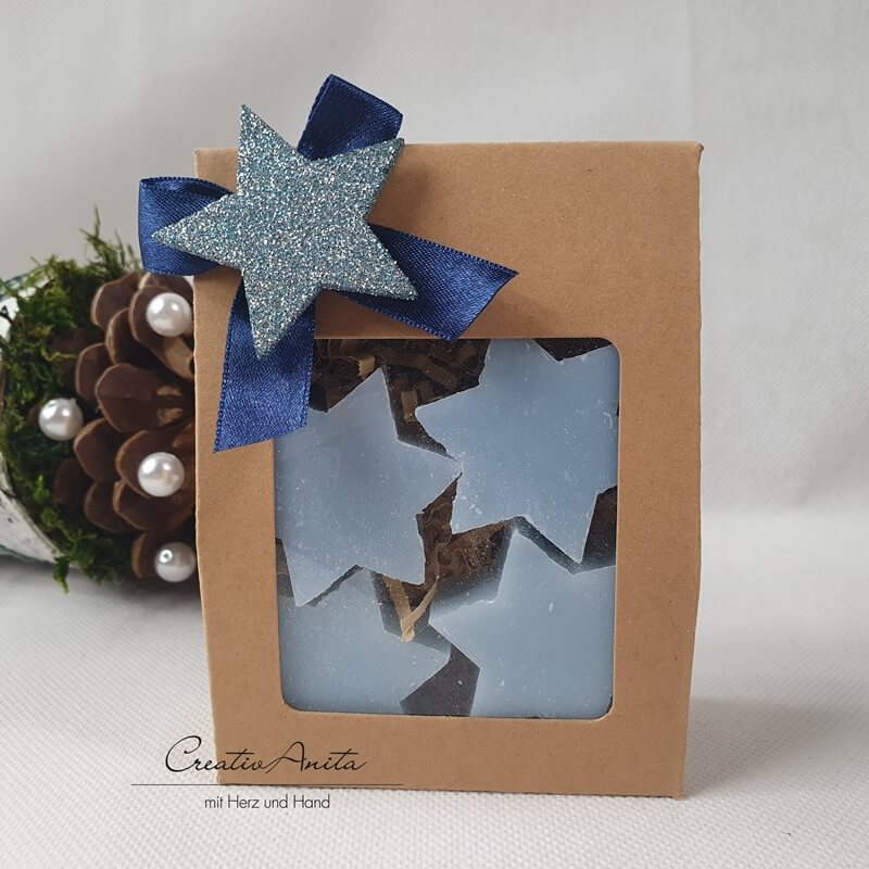 Entzückendes Weihnachtsgeschenk mit 4 Stück Seifensterne in der Duftnote EISBLUME.