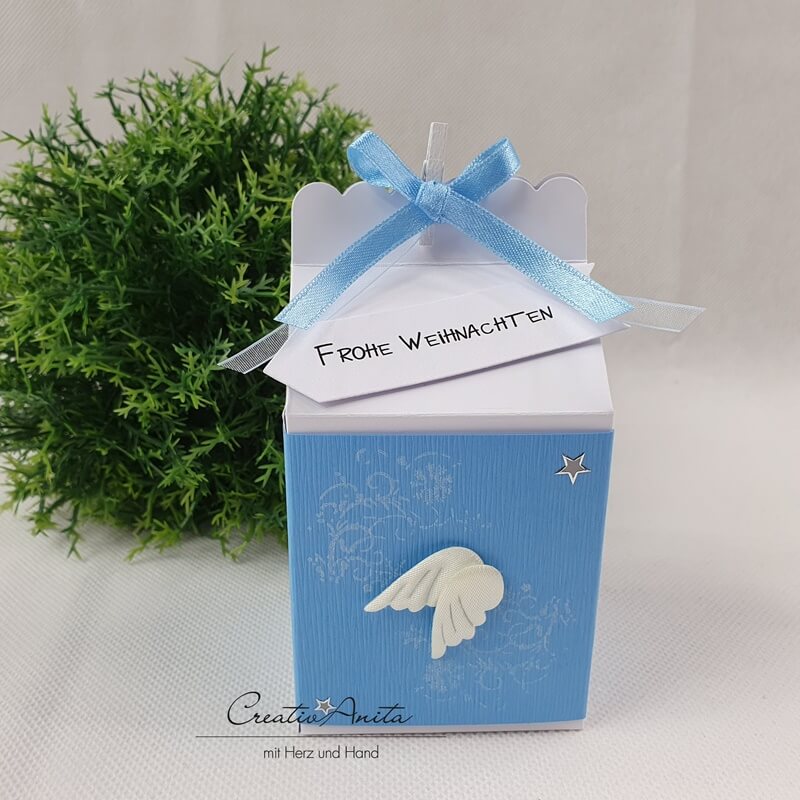 Geschenkverpackung Milchtüte in Weiß-Hellblau mit Engelsflügel