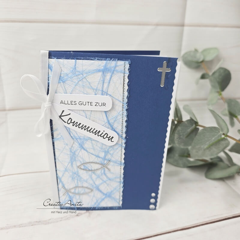 Glückwunschkarte zur Kommunion blau mit Sizo und Fische