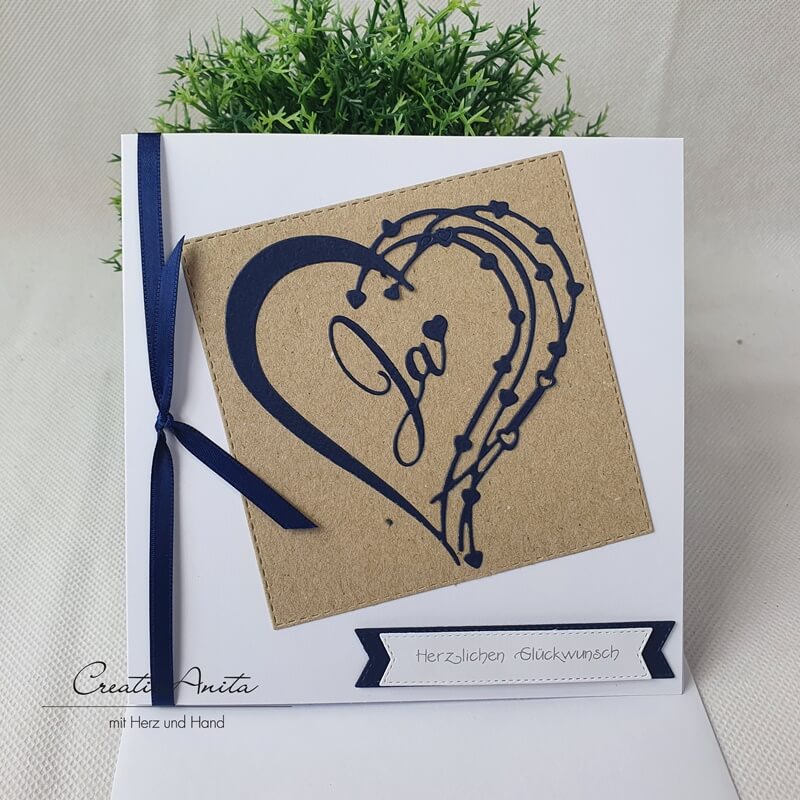 Die Vorderseite der Karte zieren verschiedene quadratische und herzige Stanzteile in Marine- und Braunfarben. Schriftzug: "JA" und "Herzlichen Glückwunsch".
