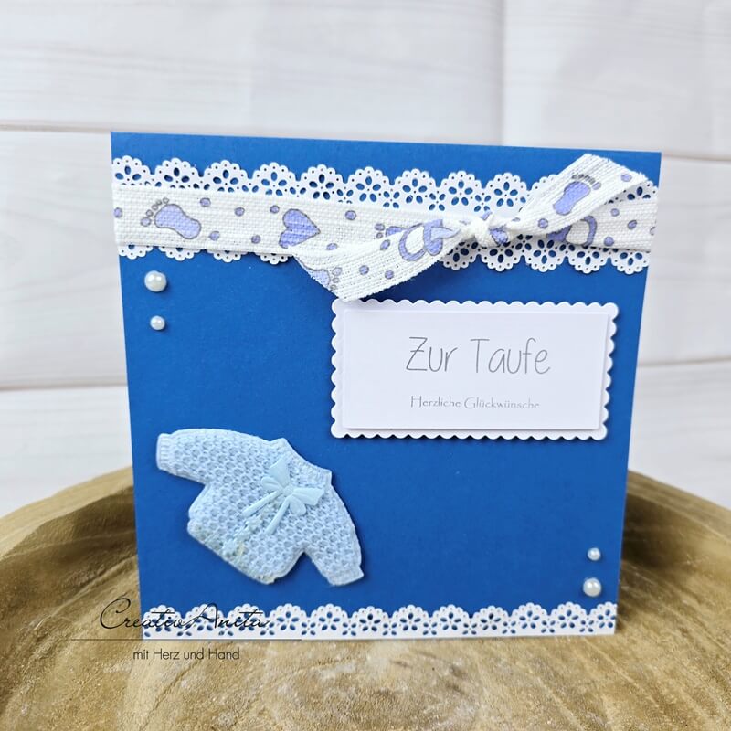 Glückwunschkarte zur Taufe BLAU mit Kinderjäckchen und Spitzenbordüre