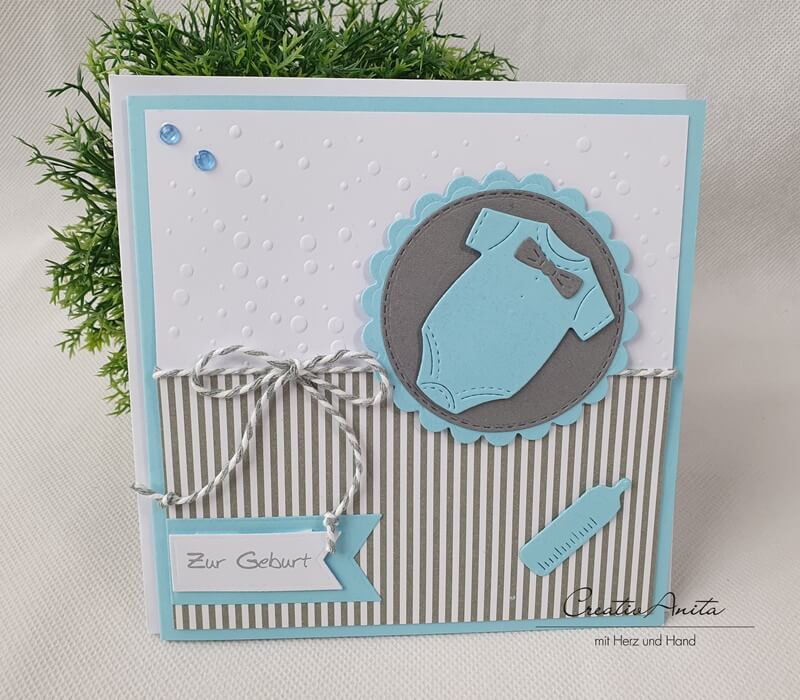Liebevoll handgefertigte Glückwunschkarte zur Geburt mit Strampler und Babyflasche