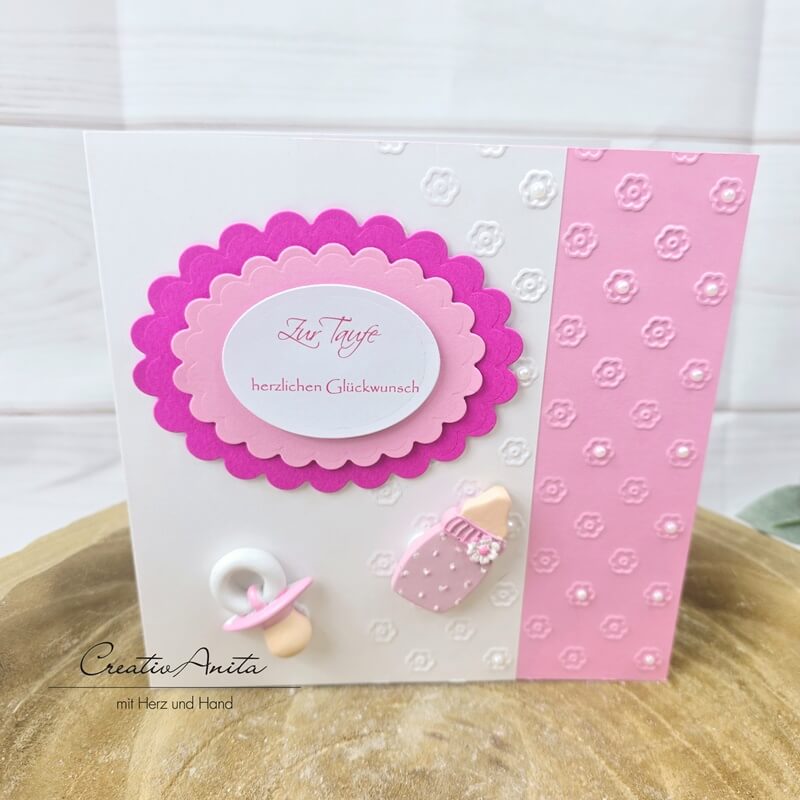 Glückwunschkarte zur Taufe mit Schnuller und Fläschchen. Seitlich wurde die Karte mit Blumenmuster geprägt und mit Halbperlen verziert.