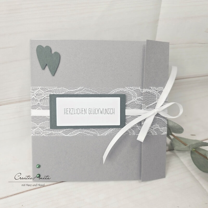 Glückwunschkarte zur Hochzeit - Edel mit Spitzenband - grau-grün