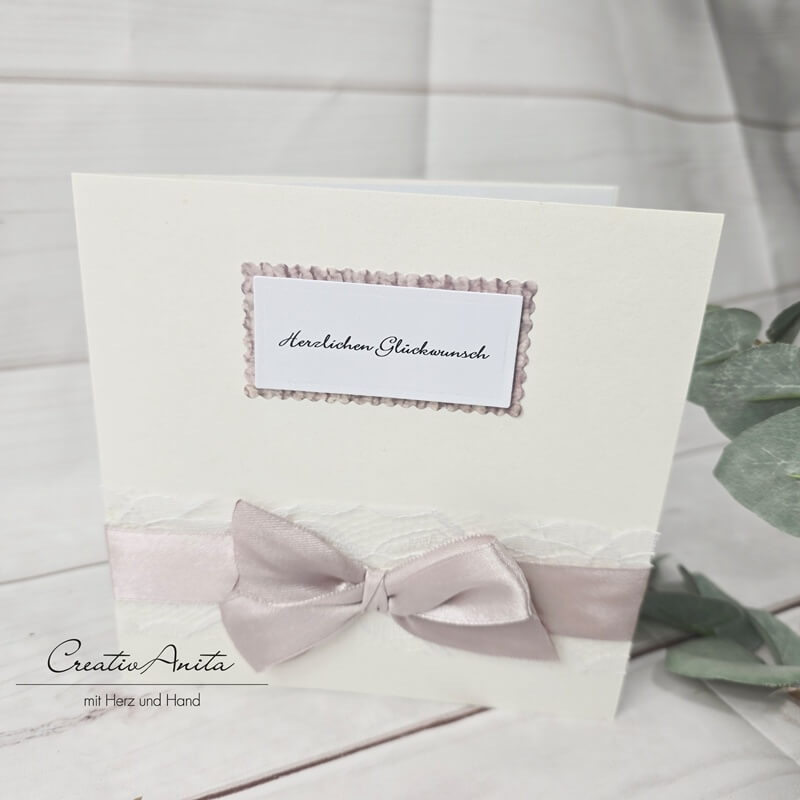 Glückwunschkarte zur Hochzeit in Perlmutt mit Spitzenband