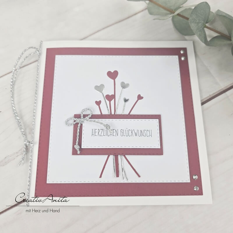 Glückwunschkarte zur Hochzeit mit Herzen in bordeaux-silber