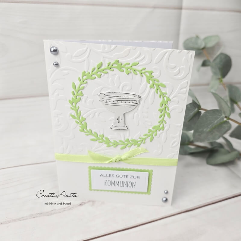 Handgearbeitete Glückwunschkarte geprägt, gestanzt und dekoriert mit silberfarbenem Kelch - kombiniert mit zartem Maigrün.