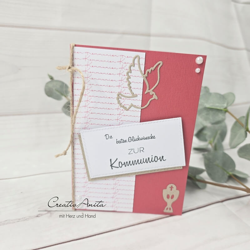 Handgestanzte Taube und ein Kelch zieren die Karte, dekoriert mit Juteband und Halbperlen