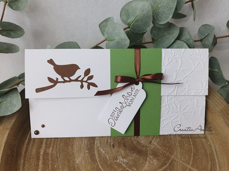 Gutschein- oder Geldgeschenkverpackung Grün-Weiß mit Vögelchen