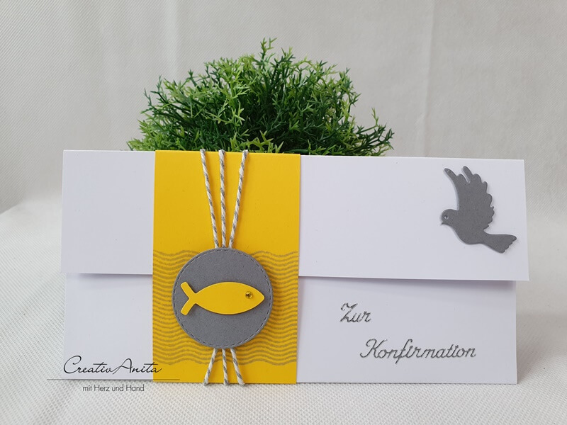 Gutschein- oder Geldgeschenkverpackung in Weiß-Gelb-Grau mit Fischen