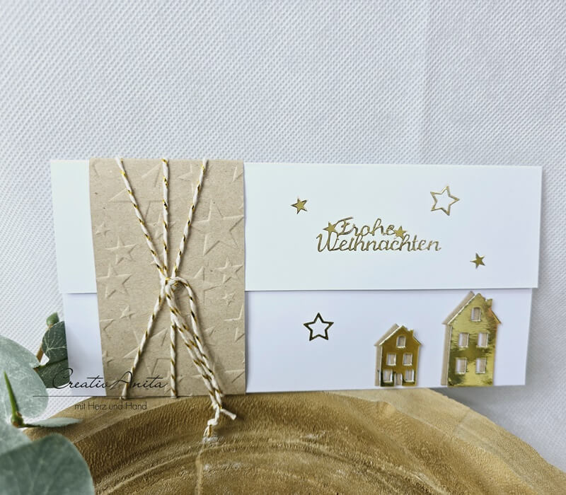 Gutschein- oder Geldgeschenkverpackung zu Weihnachten mit Häuser in Gold
