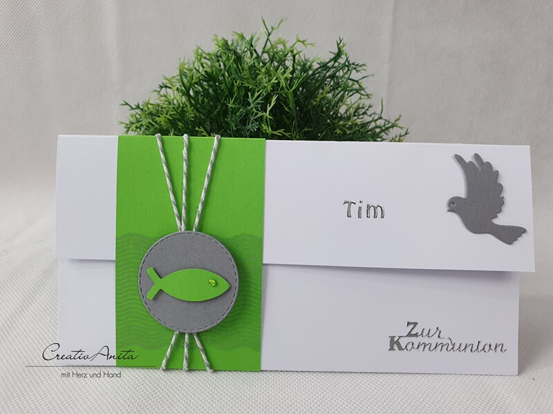 Gutschein- oder Geldgeschenkverpackung in Weiß-Apfelgrün-Grau mit Fischen