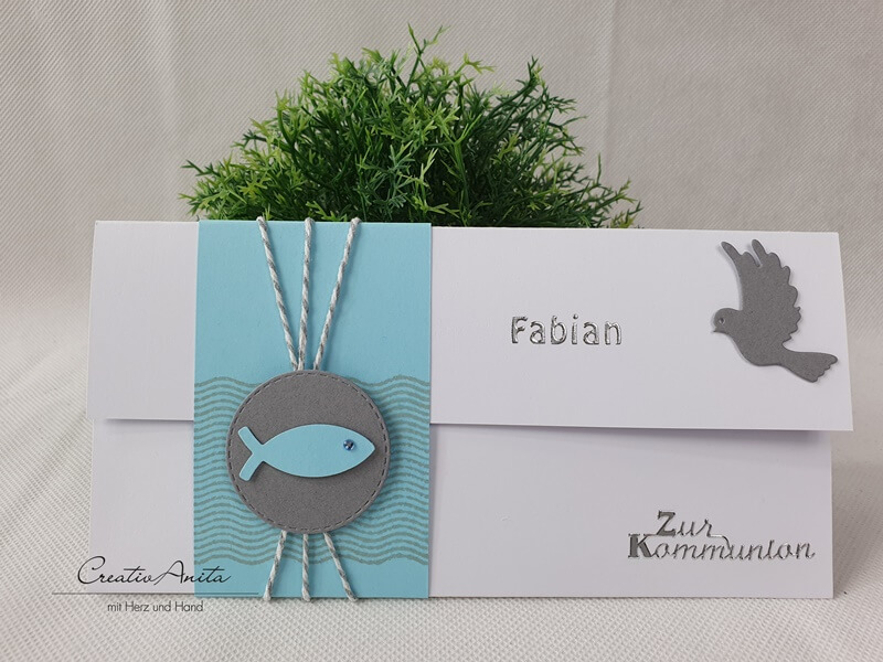 Gutschein- oder Geldgeschenkverpackung in Weiß-Hellblau-Grau mit Fischen