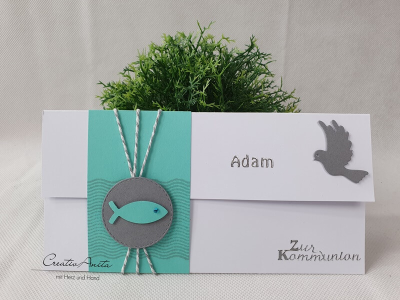 Gutschein- oder Geldgeschenkverpackung in Weiß-Mint-Grau mit Fischen