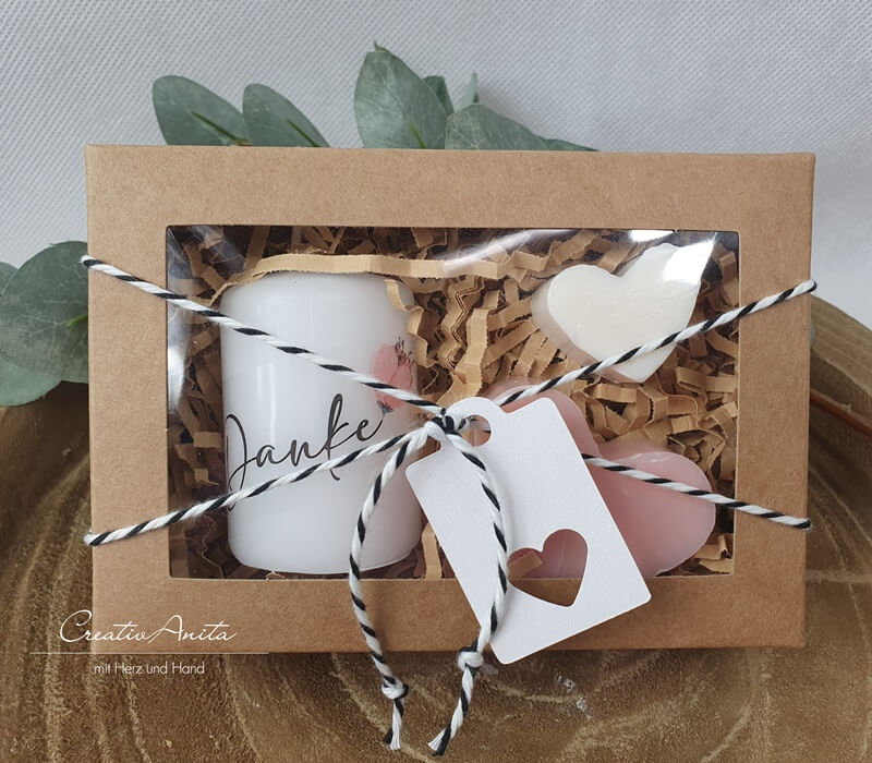 Handverziertes Kerzen-Set in Geschenkbox "Danke" & Seifenherzen - Geschenk - Kerzenset