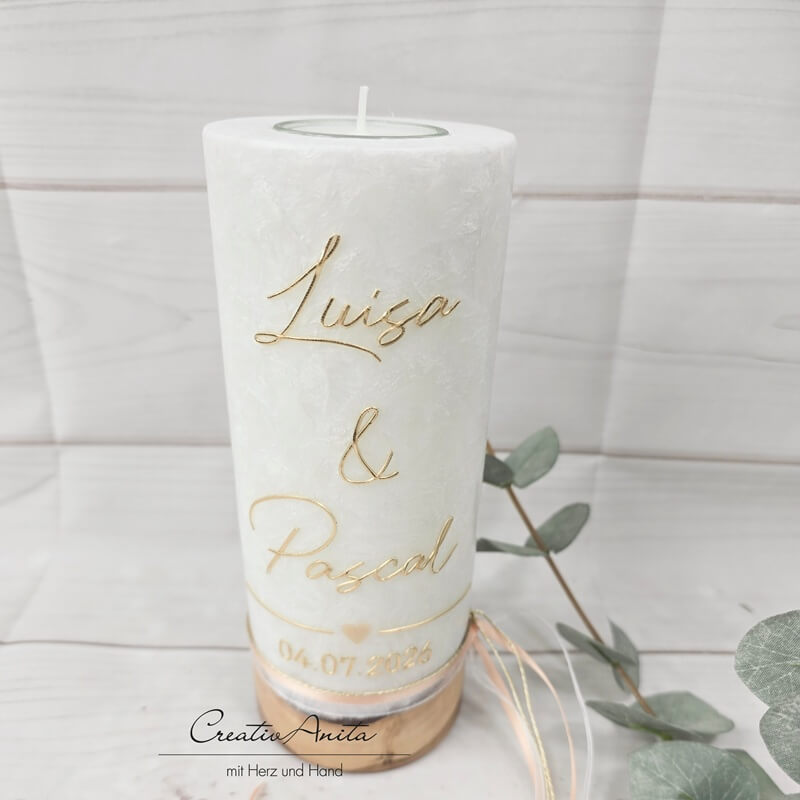 Hochzeitskerze mit echtem Holz mit/ohne Teelichteinsatz, GOLD - Apricot Herz