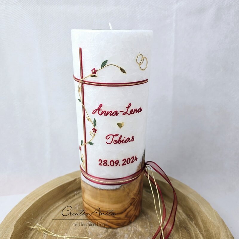 Hochzeitskerze mit echtem Holz mit/ohne Teelichteinsatz Kreuz, Blätterranke -Bordeaux-Gold-